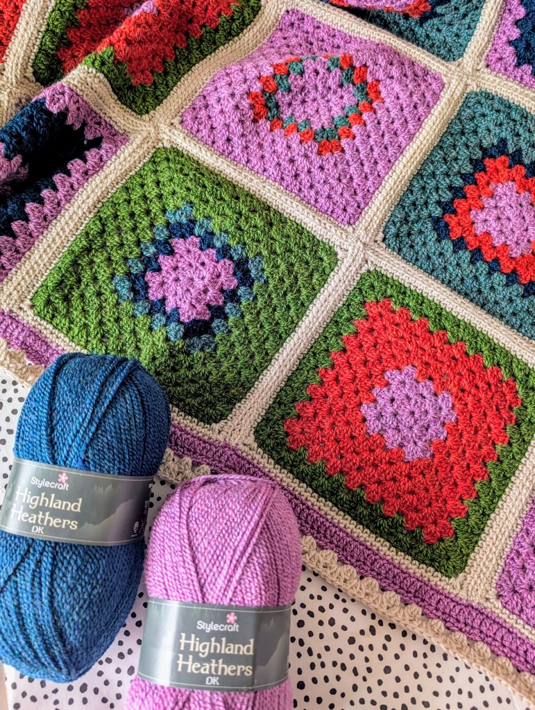 If you remember last month I found myself adding to the collection of Highland Heathers yarn as it is just so lovely. I have been making a baby blanket which started out in my mind as a pram blanket but now it is more like a cot to bed blanket. I absolutely love it!