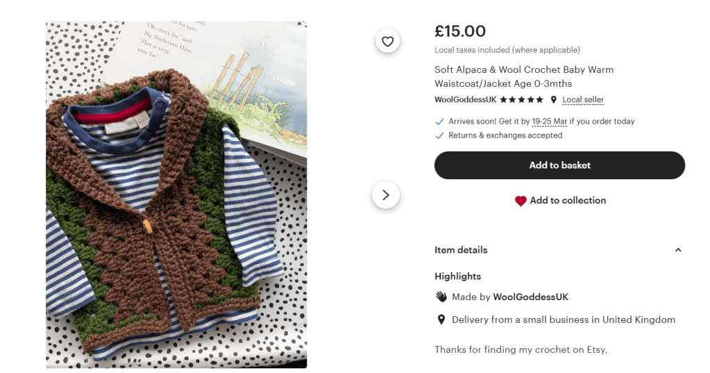 I recently made a small child’s waistcoat and listed it on Etsy for £15.