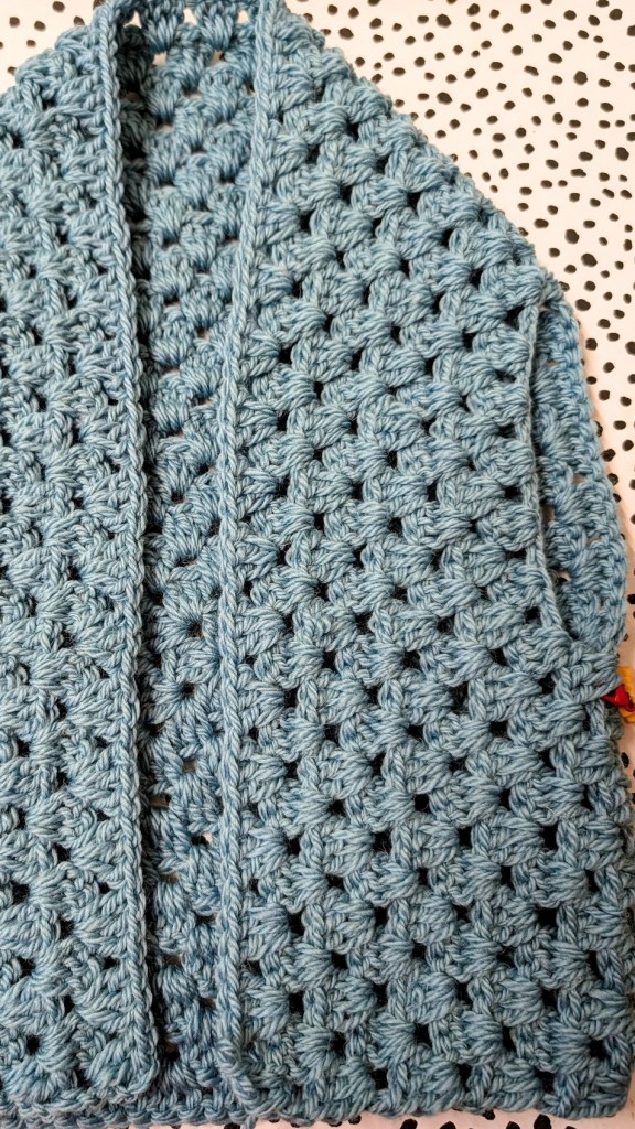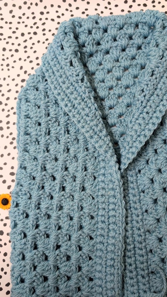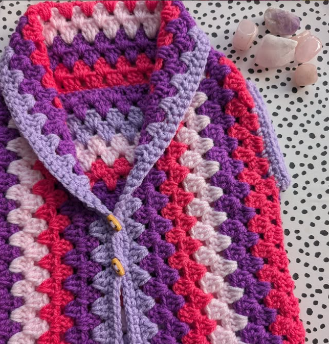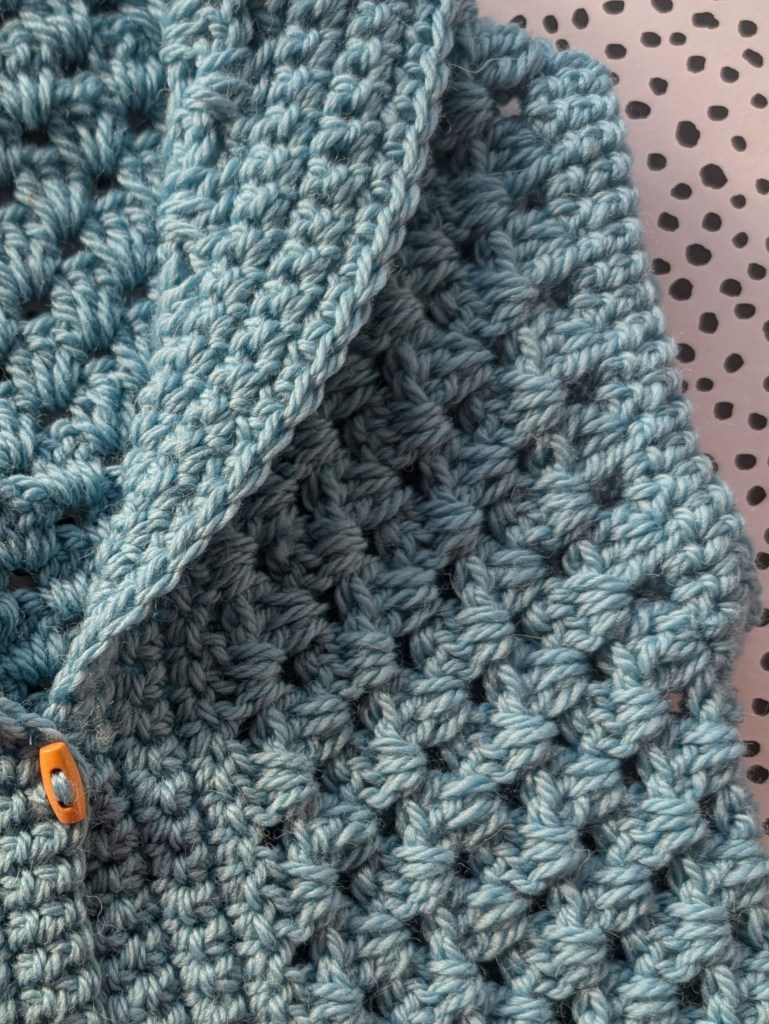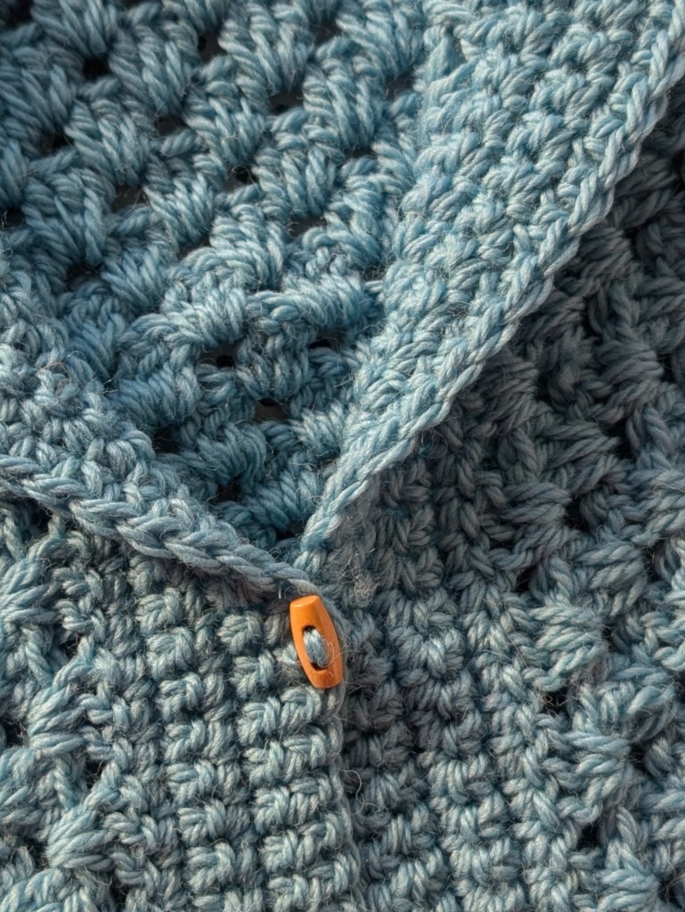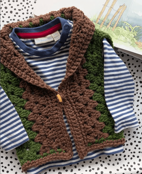 And that’s it, your cosy, handmade granny Bessie crochet body warmer is ready to wear!