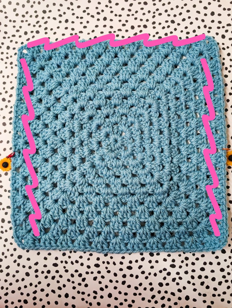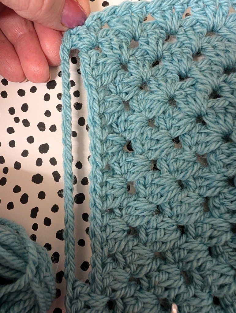 Attach your yarn at the bottom corner. You will be crocheting around three side of the granny now, not four.