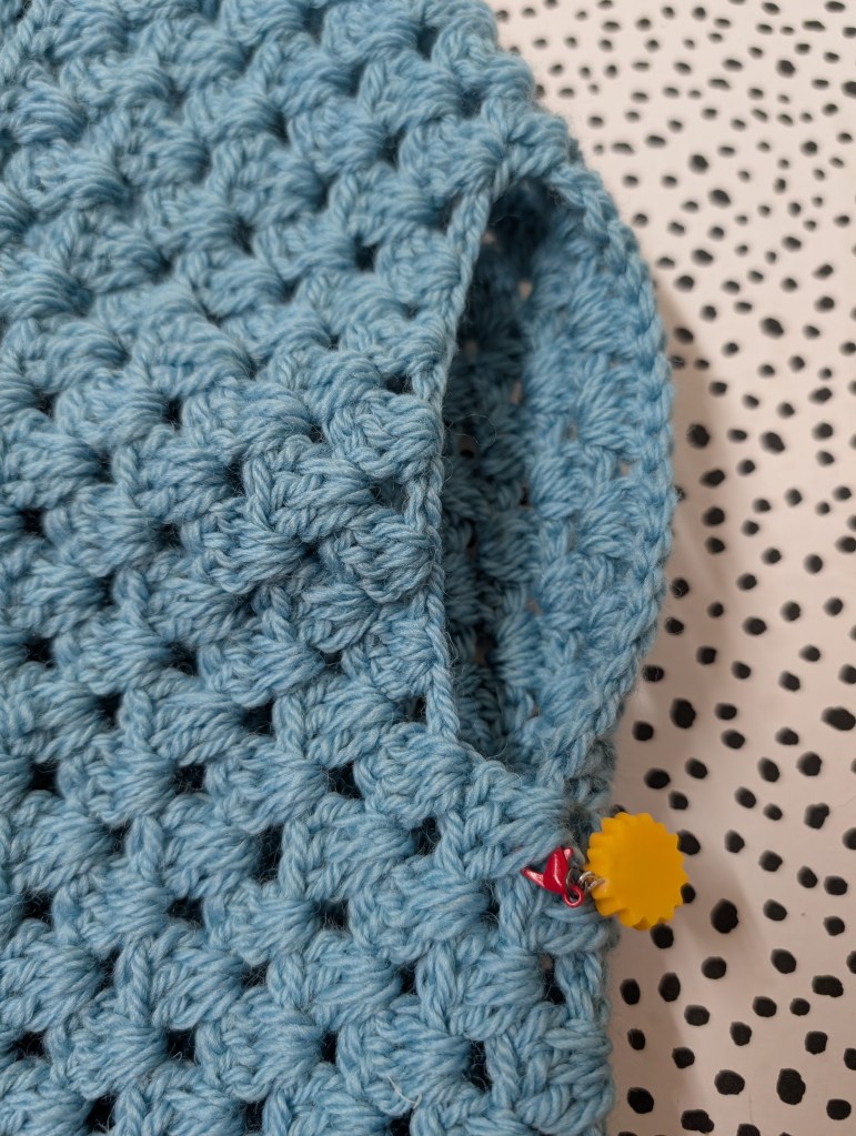 Count the number of clusters from the top corner to the stitch marker.