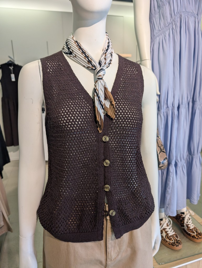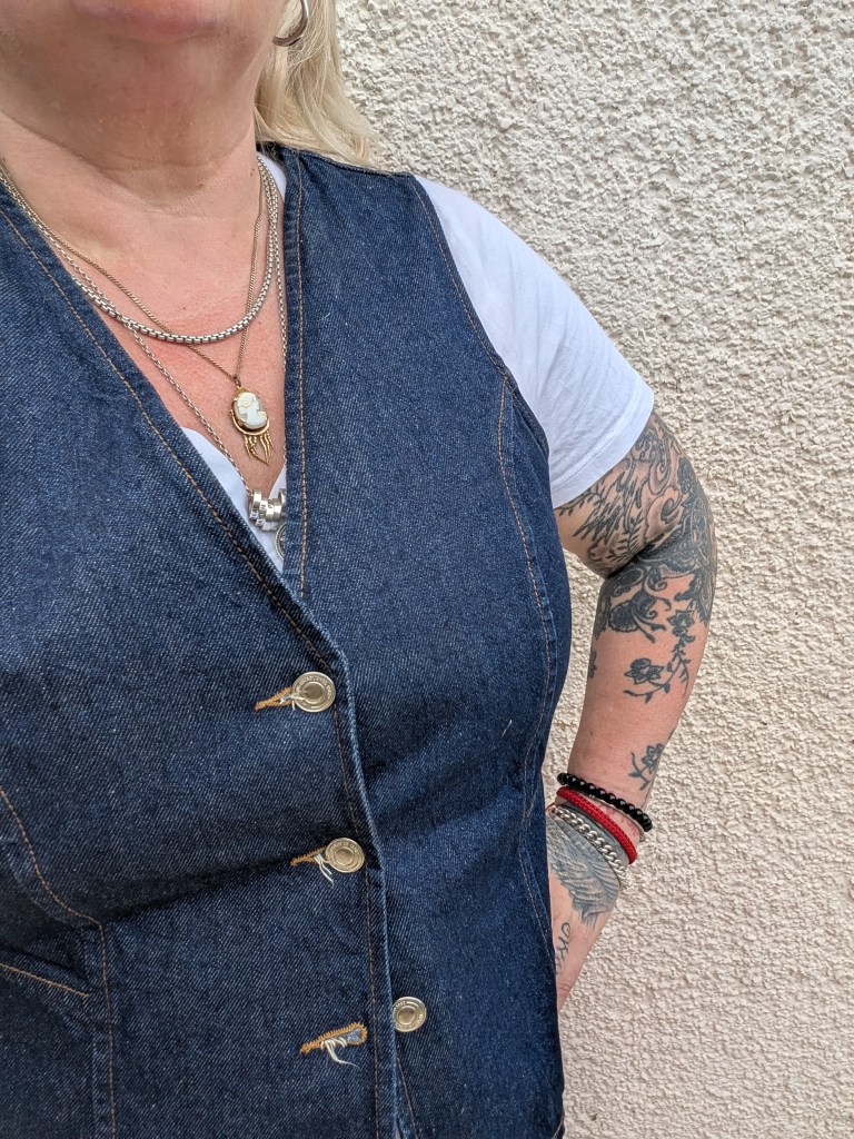 My denim waistcoat is my secret weapon. It’s flattering, versatile, and hides just enough so the girls can bounce freely without me feeling exposed.