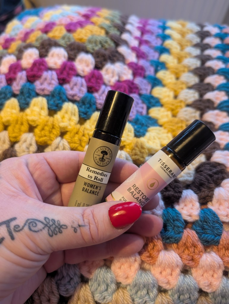 I also love ready-made blends, such as one from Neal’s Yard that brings together Patchouli, Geranium, Rose, and Frankincense, and a Tisserand blend of Rose, Geranium, and Clary Sage. Each offers its own kind of comfort, supporting emotional balance and creating a calm, nurturing atmosphere as I crochet.